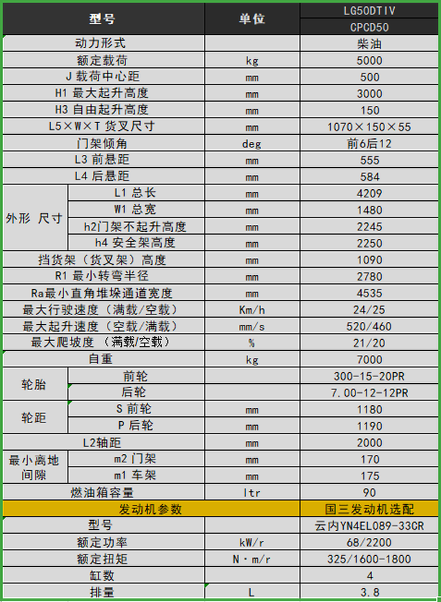 •采用全柴/锡柴国三发动机,电控增压中冷,怠速状态能满足叉车作业需求
