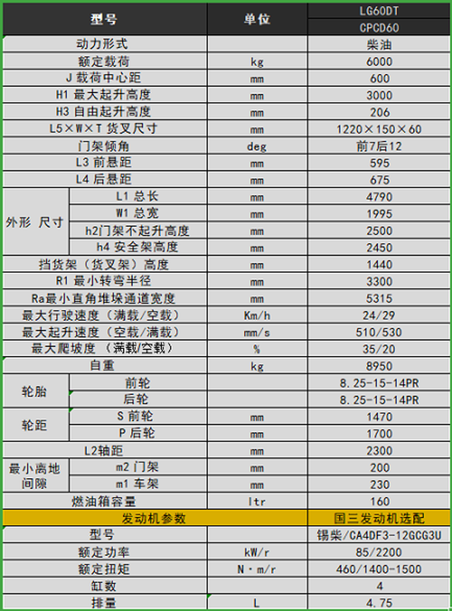 ·采用锡柴4.75L电控增压中冷柴油机,怠速状态能满足叉车作业需求,符合国家环保要求;